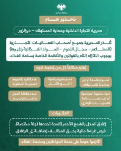 وكانت مديرية التجارة الداخلية وحماية المستهلك قد أصدرت في وقت سابق تحذيراً موجهاً إلى جميع أصحاب المحال التجارية والمطاعم ومحال اللحوم والمواد الغذائية، بضرورة الالتزام التام بالقوانين والأنظمة الخاصة بسلامة الغذاء. واعتبرت المديرية أن أي مخالفة، مثل ضبط لحوم فاسدة أو مواد منتهية الصلاحية أو عدم تقيد بالشروط الصحية والنظافة العامة، تستوجب إغلاق المحل بالشمع الأحمر وفرض غرامات مالية، وذلك حرصاً على صحة المواطنين وسلامة الغذاء.