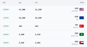 في عموم سوريا (12,250 شراء – 12,300 بيع).