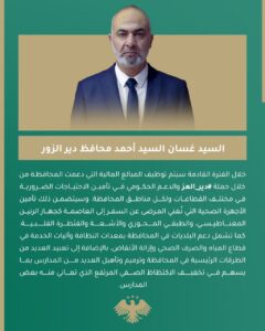 أعلن محافظ دير الزور “غسان السيد أحمد”، أن المبالغ المالية التي تلقتها المحافظة من خلال حملة تبرعات دير العز إلى جانب الدعم الحكومي، ستُوظف خلال الفترة القادمة لتأمين الاحتياجات الضرورية في مختلف القطاعات ولكافة مناطق المحافظة ريفاً ومدينة.