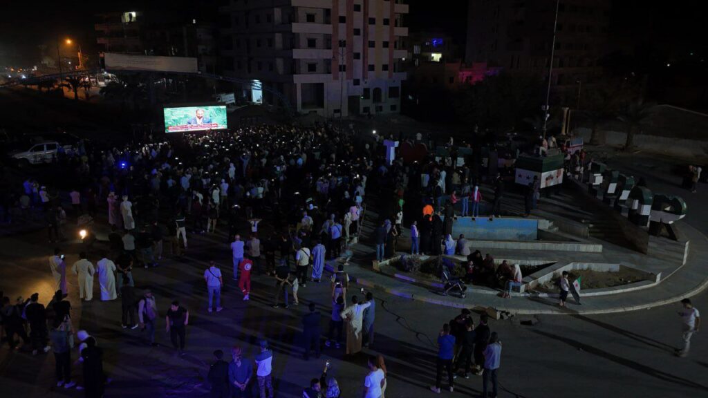 شهدت ساحة السبع بحرات وسط مدينة دير الزور أمس الأربعاء حضورًا شعبيًا واسعًا، حيث تجمّع الأهالي لمتابعة كلمة رئيس الجمهورية العربية السورية “أحمد الشرع” التي ألقاها أمام الدورة الثمانين للجمعية العامة للأمم المتحدة في نيويورك، وذلك عبر شاشات كبيرة نُصبت في الساحة خصيصاً لهذه المناسبة.