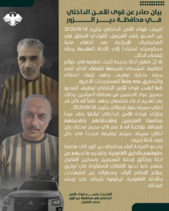 صرّح المتحدث باسم قوى الأمن الداخلي في محافظة دير الزور، “محمد العليان”، أن قوى الأمن أعادت توقيف المدعو راشد الفيصل، القيادي السابق في الميليشيات الإيرانية، وذلك بموجب مذكرة قضائية جديدة صدرت بحقه بعد ظهور أدلة إضافية تثبت ضلوعه في جرائم جديدة. كما أُعيد توقيف المدعو “حسين عواد الحسين” من منطقة الميادين، عقب تقديم ادعاء شخصي بحقه، رغم أنه كان قد أُفرج عنه في وقت سابق بقرار قضائي بتاريخ 26 أيلول 2025.