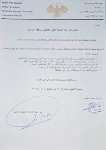 أصدرت مديرية الأمن الداخلي بمنطقة الميادين شرقي دير الزور تعميمًا رسميًا لكافة أصحاب المحلات التجارية والمطاعم والمعامل والسوبرماركت ومكاتب الصرافة، وذلك بناءً على توجيهات مدير الأمن في المنطقة، وفي إطار تعزيز الأمن والحفاظ على الممتلكات العامة والخاصة.