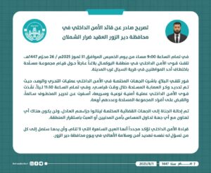 وأشار قائد الأمن الداخلي في دير الزور إلى إحالة الجناة إلى الجهات القضائية المختصة لينالوا جزاءهم العادل، مؤكداً أنه لن يكون هناك أي تهاون مع أي جهة تحاول المساس بأمن المدنيين أو العبث باستقرار المنطقة.