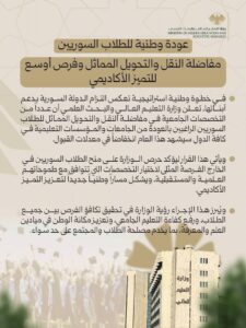 وتأتي هذه الإجراءات ضمن سياسات التعليم العالي لدعم الكفاءات السورية، وتوفير البيئة الأكاديمية المناسبة لعودتهم، بما يعكس التزام الدولة بتأمين حق التعليم وتعزيز الانتماء الوطني بين أبنائها في الداخل والخارج.