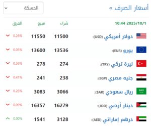 في سوق الحسكة (11500 شراء – 11550 بيع).