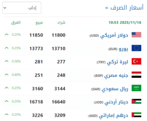 في سوق إدلب (11800 شراء – 11850 بيع).