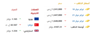 وسجّل سعر غرام الذهب (1,241,000 ليرة سورية_عيار18)، و(1,447,000 ليرة سورية_عيار21).