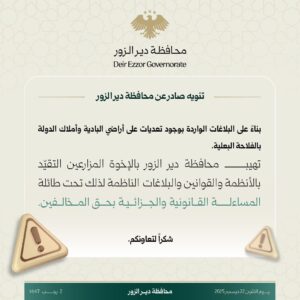 ودعت محافظة دير الزور إلى التقيد التام بالأنظمة والقوانين والتعليمات الصادرة بهذا الشأن، والالتزام بالإجراءات القانونية المعتمدة قبل الشروع بأي نشاط زراعي على أراضي الدولة، محذّرة من أن أي مخالفة ستعرّض مرتكبيها للمساءلة القانونية والجزائية.