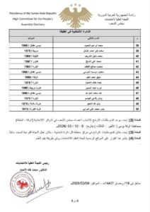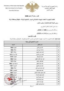 وأشارت اللجنة إلى أنه يُحدد موعد تقديم طلبات الترشح لانتخاب أعضاء مجلس الشعب في الدوائر الانتخابية (الرقة – الطبقة) بمحافظة الرقة يومي (الإثنين – الثلاثاء) بتاريخ: 9 – 10/ 03 / 2026م.