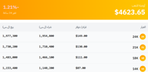 وسجّل سعر غرام الذهب (1,466,100 ليرة سورية_عيار18)، و(1,710,400 ليرة سورية_عيار21).